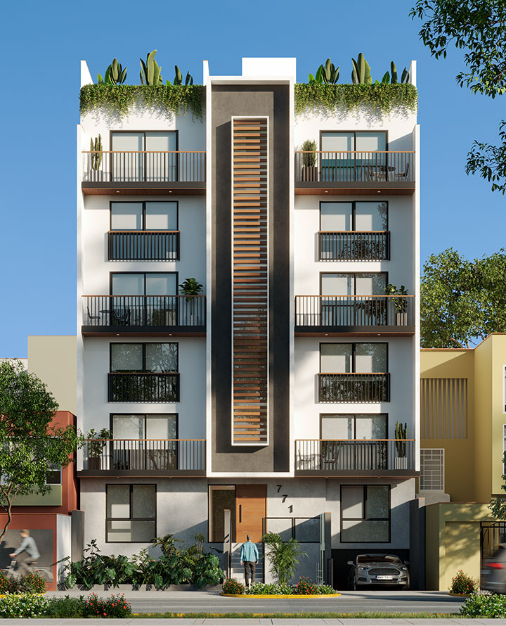 Edificio de 6 pisos ubicado en la calle Valladolid 151, con un diseño cálido, moderno y rodeado de parques.